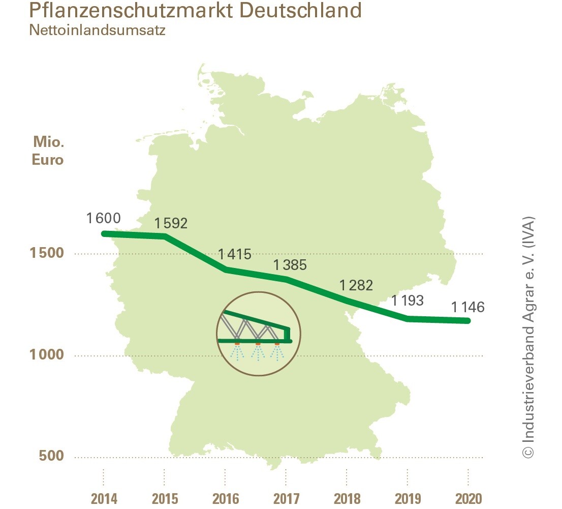 Die anhaltend schwache Nachfrage nach Pflanzenschutzmitteln hat den Inlandsumsatz der im IVA organisierten Herstellerfirmen im Geschäftsjahr 2020 abermals um 3,9 Prozent auf 1,146 Milliarden Euro (2019: 1,193 Mrd. Euro) schrumpfen lassen. Dass Landwirte Pflanzenschutzmittel sparsam und mit Bedacht einsetzen, spiegelt sich auch in den Absatzzahlen des Jahres 2019, die das Bundesamt für Verbraucherschutz und Lebensmittelsicherheit (BVL) jetzt veröffentlichte: Mit 27 496 Tonnen erreichte der Absatz (bereinigt um Sondereffekte) den niedrigsten Wert seit der Wiedervereinigung.