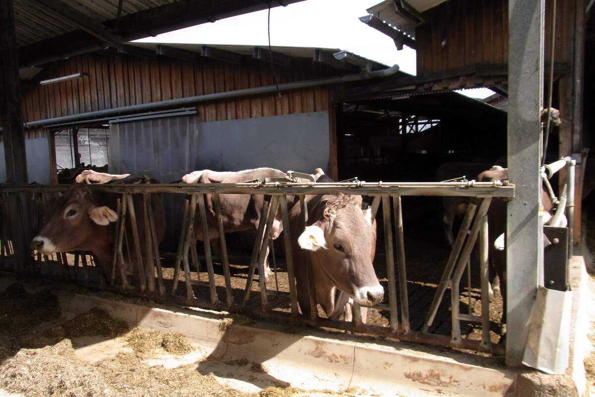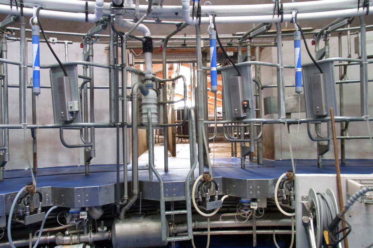 Das Argument, den Melkprozess so insgesamt beschleunigen und zweimal am Tag abschließen zu können, überzeugte am Ende mehr als die Möglichkeit, die Kühe von einem Roboter ohne feste Melkzeiten melken lassen zu können. „Die hierfür nötige Technik und PC-Affinität ließ uns von einem automatischen Melksystem abkommen“, sagt David Mayer, der einräumt, dass der jetzt eingebaute Innenmelker allerdings höhere Kosten verursachte, weil dafür ein eigener Raum und ein Wartebereich geschaffen werden mussten. Dagegen laufe die Technik weitgehend störungsfrei, die Arbeit lasse sich einfach organisieren, beispielsweise könne der Boxenlaufstall gesäubert werden, wenn die Kühe in den Warteraum getrieben worden sind. Zudem könnten die Kühe beim Austrieb aus dem Karussell genau selektiert werden.