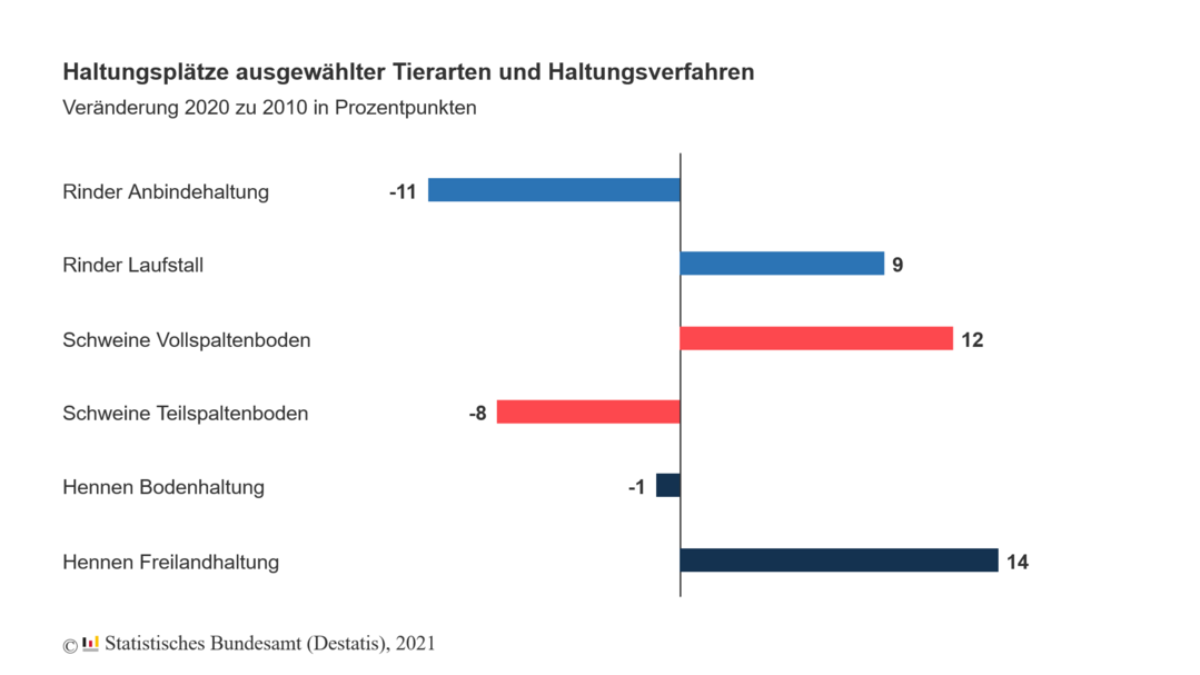 Wie das Statistische Bundesamt (Destatis) auf Basis der endgültigen Ergebnisse der Landwirtschaftszählung mitteilt, wurden am 1. März 2020 83 % der Rinder im Laufstall und 79 % der Schweine auf Vollspaltenboden gehalten. Mit einem Anteil von 65 % dominierte bei der Haltung von Legehennen weiterhin die Bodenhaltung. 2010 lagen die Anteile bei 74 % (Rinder im Laufstall), 67 % (Schweine auf Vollspaltenboden) und 66 % (Legehennen in Bodenhaltung).