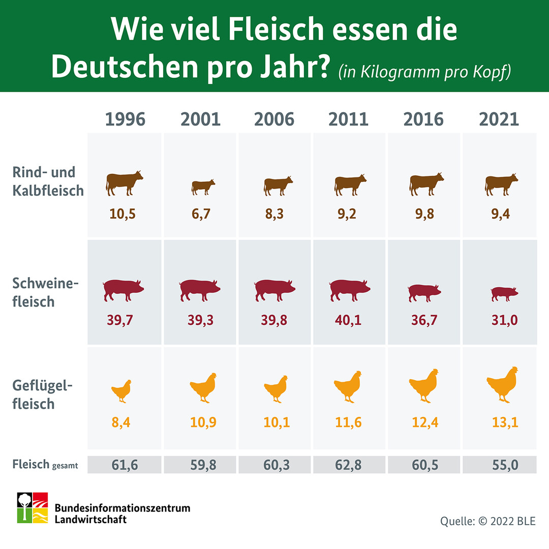 Der Pro-Kopf-Verzehr von Fleisch sank 2021 im Vergleich zu 2020 um 2,1 Kilogramm und liegt damit auf einem neuen Rekordtief von 55 Kilogramm (seit dem Beginn der Berechnung des Verzehrs 1989). Auch das Gesamtvolumen der Fleischerzeugung war rückläufig. Das zeigen die vorläufigen Angaben des Bundesinformationszentrums Landwirtschaft (BZL).