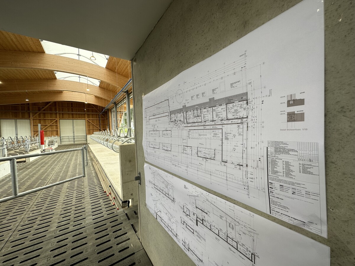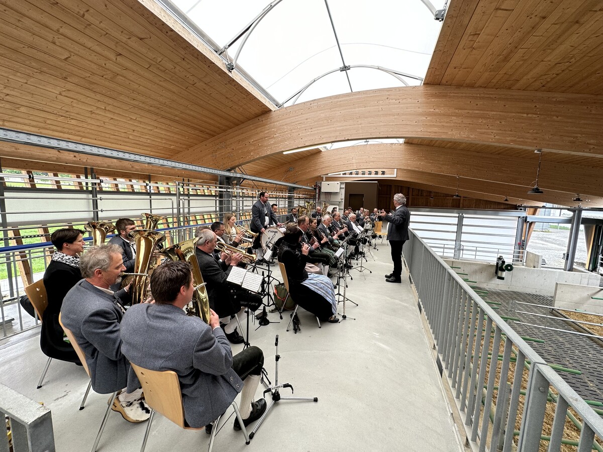 Ebenso bezugsfertig ist der neue AMS-Stall, der als dreireihiger Milchviehlaufstall mit offenen Längsseiten und einem außenliegenden Laufhof konzipiert ist, und in dem 75 Tiere gehalten werden können.