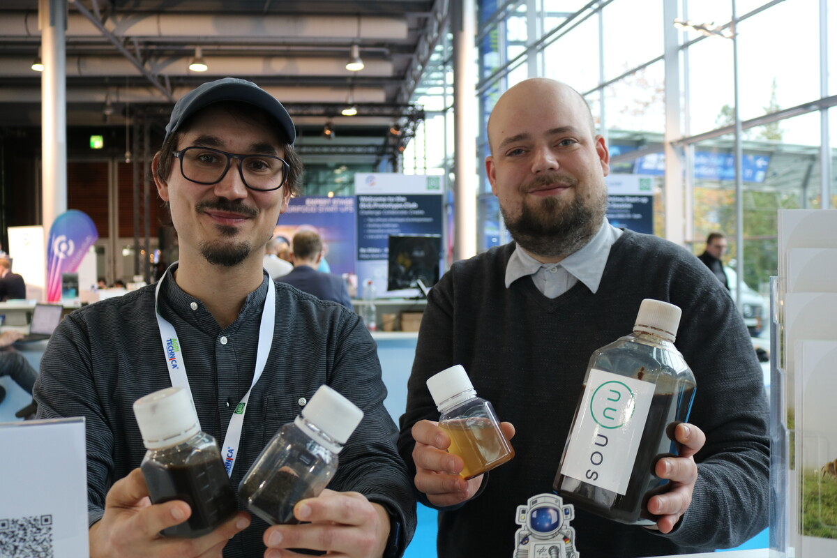 Angefangen hat das Projekt auf dem Mars. Forscher des DLR befassten sich mit der Frage, wie stickstoffhaltige Abwässer auf dem roten Planeten verwertet und Kreisläufe geschlossen werden können, unter anderem in Gewächshäusern. Man stellte fest, dass die gleichen Fragen die irdische Landwirtschaft beschäftigen. Also entwickelte Nunos ein Verfahren zur biologischen Gülleaufbereitung. Einmal eingefüllt in die Aufbereitungsanlagen ist die Gülle wetterunabhängig auszubringen. Das Endprodukt soll direkt pflanzenverfügbar sein und so Kosten für Mineraldünger reduzieren. Zudem sollen Emissionen wie zum Beispiel Ammoniak in der Atmosphäre erheblich reduziert werden. Nunos möchte sich demnächst vom DLR ausgliedern, so die Forscher Holger Sommerlad (l.) und Fabian Mierbach.