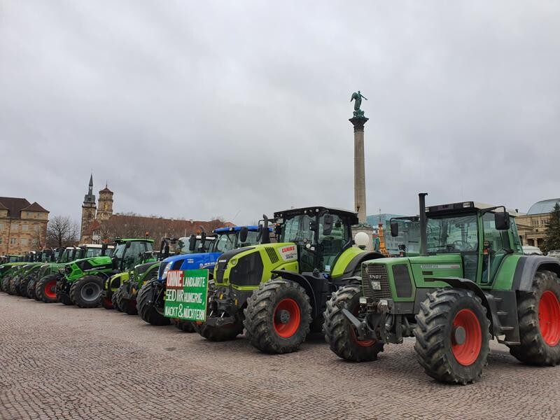 Mit rund 1000 Traktoren und mindestens doppelt so vielen Teilnehmern protestierten am Donnerstag, den 21. Dezember, die Bäuerinnen und Bauern aus Baden-Württemberg lautstark gegen die Sparpläne der Bundesregierung. In der Kundgebung vor dem Landwirtschaftsministerium forderte unter anderem Jürgen Maurer, der Vizepräsident des Landesbauernverbandes, die vollständige Rücknahme der Steuererhöhungspläne. Die Vorschläge, die Agrardieselvergütung und die Kfz-Steuerbefreiung zu streichen, würde die heimische Landwirtschaft mit rund einer Milliarde Euro jährlich enorm belasten. Zu der Demonstration hatten alle landwirtschaftlichen Verbände gemeinsam aufgerufen.