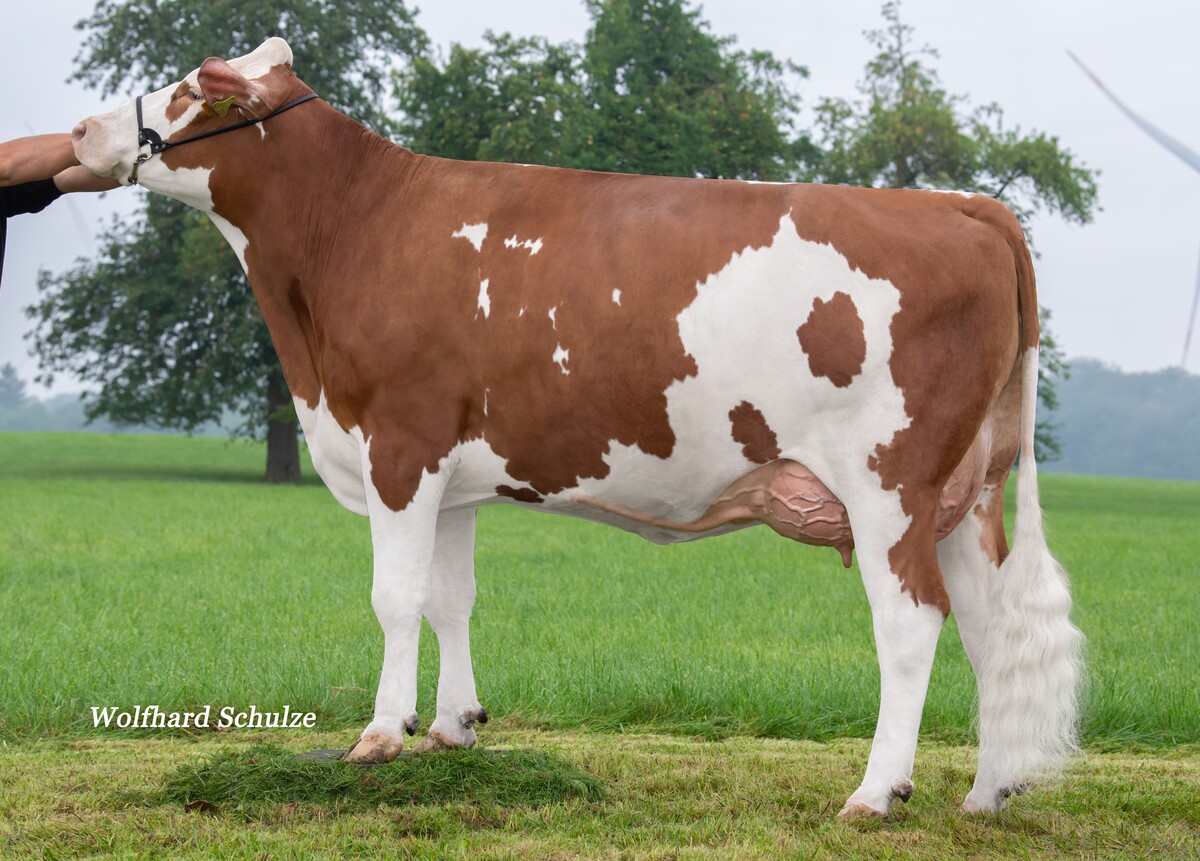 Auch Seraphim (GZW 141) stammt aus einer Zeiger-Mutter und wurde damit aus der Wipoch-Familie gezogen. Er vererbt deutlich positive Inhaltsstoffe und sehr hochaufgehängte, kompakte Euter mit einer idealen Strichform. Noch stärker in der Eutervererbung ist Siena (GZW 139), der von Rebecca Gerstmeier in Hundslohe gezüchtet wurde. Siena wird bei positiven Eiweißprozenten und einer ansprechenden Milchmenge nicht nur die Eutergesundheit und Fruchtbarkeit verbessern, sondern punktet zudem mit hoch aufgehängten Eutern mit bestem Zentralband.