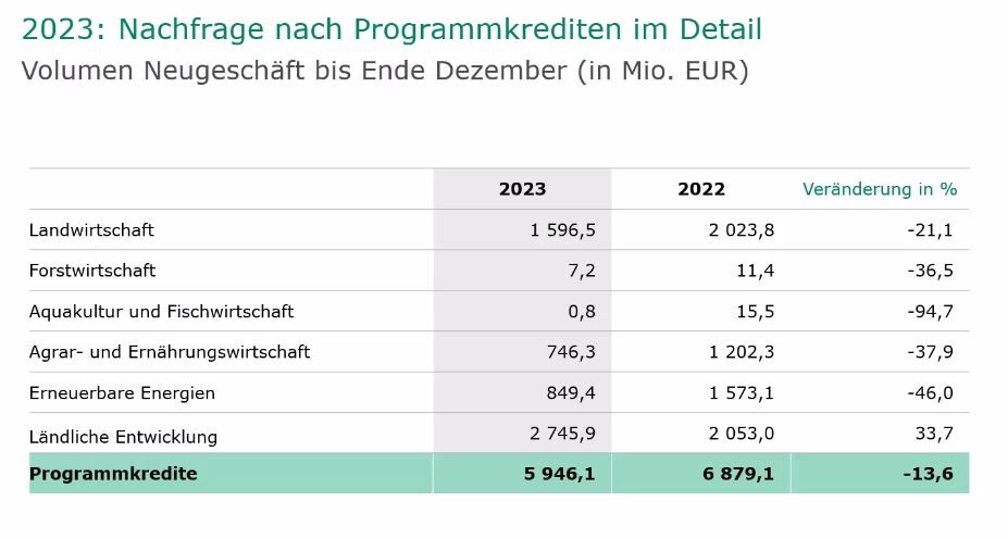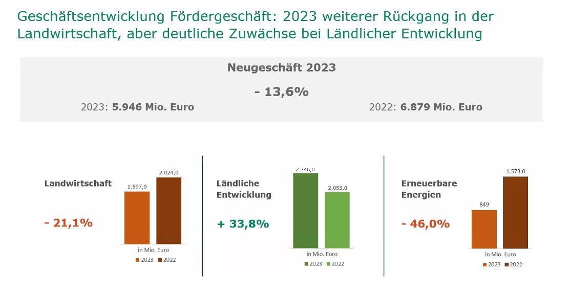 Die Investitionszurückhaltung der Branche spiegelt sich auch im Fördergeschäft der Rentenbank wider. Das Förderneugeschäft mit zinsgünstigen Programmkrediten ging über alle Sparten hinweg um 13,6 % auf 5,9 Mrd. Euro zurück (2022: 6,9 Mrd. Euro). Den volumenmäßig stärksten Rückgang verzeichneten die Fördersparten „Landwirtschaft“, „Erneuerbare Energien“ sowie „Agrar- und Ernährungswirtschaft“. Hier wirkten sich vor allem ausbleibende Investitionen in Wirtschaftsgebäude und Maschinen sowie die rückläufige Nachfrage nach Windkraftfinanzierungen dämpfend aus. Dagegen konnte das Neugeschäft in der Fördersparte „Ländliche Entwicklung“ aufgrund der hohen Nachfrage der Landesförderinstitute nach Globaldarlehen der Rentenbank erneut gesteigert werden.