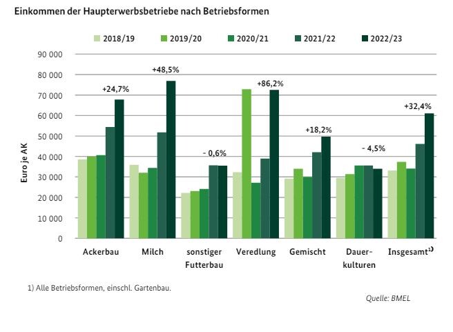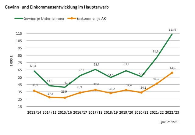 Laut der Hochrechnung des Bundesministeriums für Ernährung und Landwirtschaft (BMEL) stieg das durchschnittliche Einkommen je Arbeitskraft in den Haupterwerbsbetrieben gegenüber dem Vorwirtschaftsjahr um 32 Prozent auf rund 61.000 Euro. Der durchschnittliche Gewinn lag mit 113.900 Euro rund 39 Prozent über dem Vorjahreswert (81.900 Euro). Damit ist das vergangene Wirtschaftsjahr für Haupterwerbsbetriebe nach Einkommen und Gewinn das mit Abstand erfolgreichste in den vergangenen zehn Jahren.