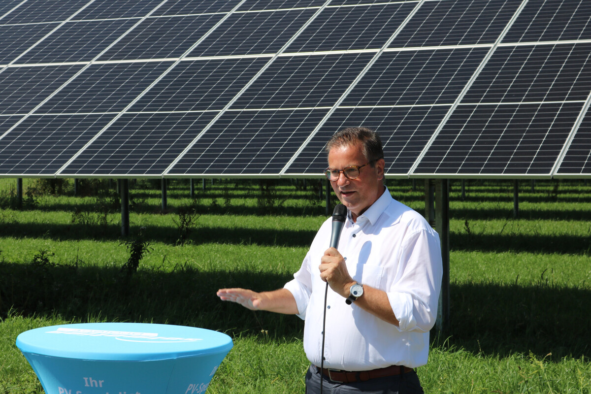 Solmotion-Geschäftsführer Christian Wolf hätte es sich bei der Planung der Anlage vor drei Jahren selbst kaum vorstellen können, dass diese Anlage so schnell Realität wird. „Das zeigt, wie dynamisch und schnell wachsend die Solarbranche ist“, dankte Wolf allen Beteiligten. Was die Branche derzeit beschäftige, sei der insgesamt schleppende Netzausbau. Hier geht es seiner Meinung nach viel zu wenig voran. „Wir haben in unseren Projekten ein halbes Giga-Watt (500 Megawatt) an Vorlauf in der Entwicklung“, so Wolf. Laut Wolf werden bei Solmotion neue Anlage meist nur noch mit Stromspeicher projektiert. Das Risiko von negativen Strompreisen ließe sich mit einem Batteriespeicher in den Griff bekommen. Je komplexer und individueller die Anlagen geplant würden, desto besser könne die Firma mit ihren langjährigen Erfahrungen punkten, hofft Wolf. Was Agri-PV angeht, zeigte er sich zuversichtlich: „Wir planen für nächstes Jahr 40 Megawatt Agri-PV zu installieren. Das wäre das Vierfache von heute“, so Wolf.