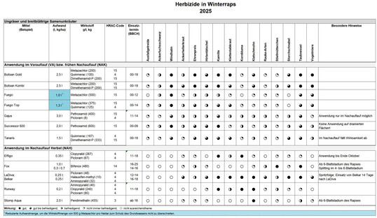 Wo mechanische Verfahren nicht möglich oder ausreichend sind, können Herbizid-Anwendungen im Winterraps notwendig sein. Die Wahl der Herbizide und des Anwendungszeitpunktes richtet sich nach der Verunkrautung und den Anwendungsbedingungen. Eine wichtige Voraussetzung für eine gute Wirkung der Mittel im Vorauflauf (nach der Saat bis zum Beginn des Auflaufens der Rapskeimlinge) ist ein abgesetzter, feuchter Boden. Auf vielen Flächen, vor allem in der Nähe von Wohngebieten, ist die Anwendung von Clomazone-haltigen Mitteln aufgrund der Anwendungsbestimmungen NT154 bzw. NT155 (Abstand von 50 Metern bei Kombimitteln bzw. 20 Metern bei Solomitteln ohne Tankmischung mit anderen Pflanzenschutzmitteln oder Zusatzstoffen) zu Ortschaften, Haus- und Kleingärten, Flächen mit bekannt clomazone-sensiblen Anbaukulturen, zum Beispiel Gemüse und Beerenobst, sowie Flächen, die für die Allgemeinheit bestimmt sind, und Flächen, die gemäß der Ökoverordnung und Diätverordnung bewirtschaftet werden, nicht möglich. Bei entsprechenden örtlichen Verhältnissen und wenn Tageshöchsttemperaturen von mehr als 25 °C vorhergesagt sind (NT127), müssen Clomazone-freie Herbizide zur Anwendung kommen. Unter wettergefahren.de kann eine Vorhersage des Deutschen Wetterdienstes abgerufen werden. Bei der Anwendung von Clomazone wird empfohlen, einen Ausdruck der Vorhersage der Dokumentation beizulegen.