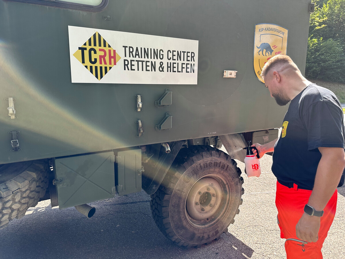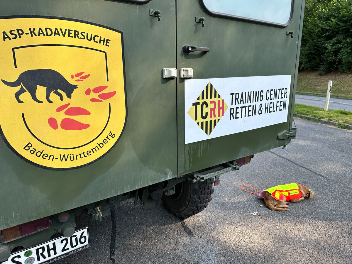 Ehrenamtlich engagieren sich auch auch Uwe Deißler und Sandra Rapp mit ihren Hunden. Deißler ist Berufssoldat außer Dienst und Jäger aus Isny im Allgäu. Seit rund einer Woche ist er in Suchteams des TCRH (Training Center Retten und Helfen GmbH) aus Mosbach unterwegs. Hier hat Hündin Rosa die Ausbildung zum ASP-Kadaversuchhund absolviert und eigentlich der wichtigere Teil des Gespanns. Ihre feine Nase wittert die Wildschweine und freut sich, den ganzen Tag mit ihrem Herrchen im Wald verbringen zu können. Beide Hundebesitzer bestätigen: Die Hunde haben die größte Freude, wenn sie etwas finden. Das sei eine solche Belohnung, dass sogar Leckerchen uninteressant werden. Bis zu zehn Stunden ist ein Hundesuchteam am Tag im Einsatz. Deißler und Rapp sind in den acht Tagen, die sie nun vor Ort sind an vier Tagen unterwegs gewesen. Bei 30 Grad Hitze und im Bergland der Kurpfalz. Hund und Herrchen sind am Abend müde. Jeder Einsatz endet mit der Desinfektion von Fahrzeugen, Kleidung, Hund und Halter.