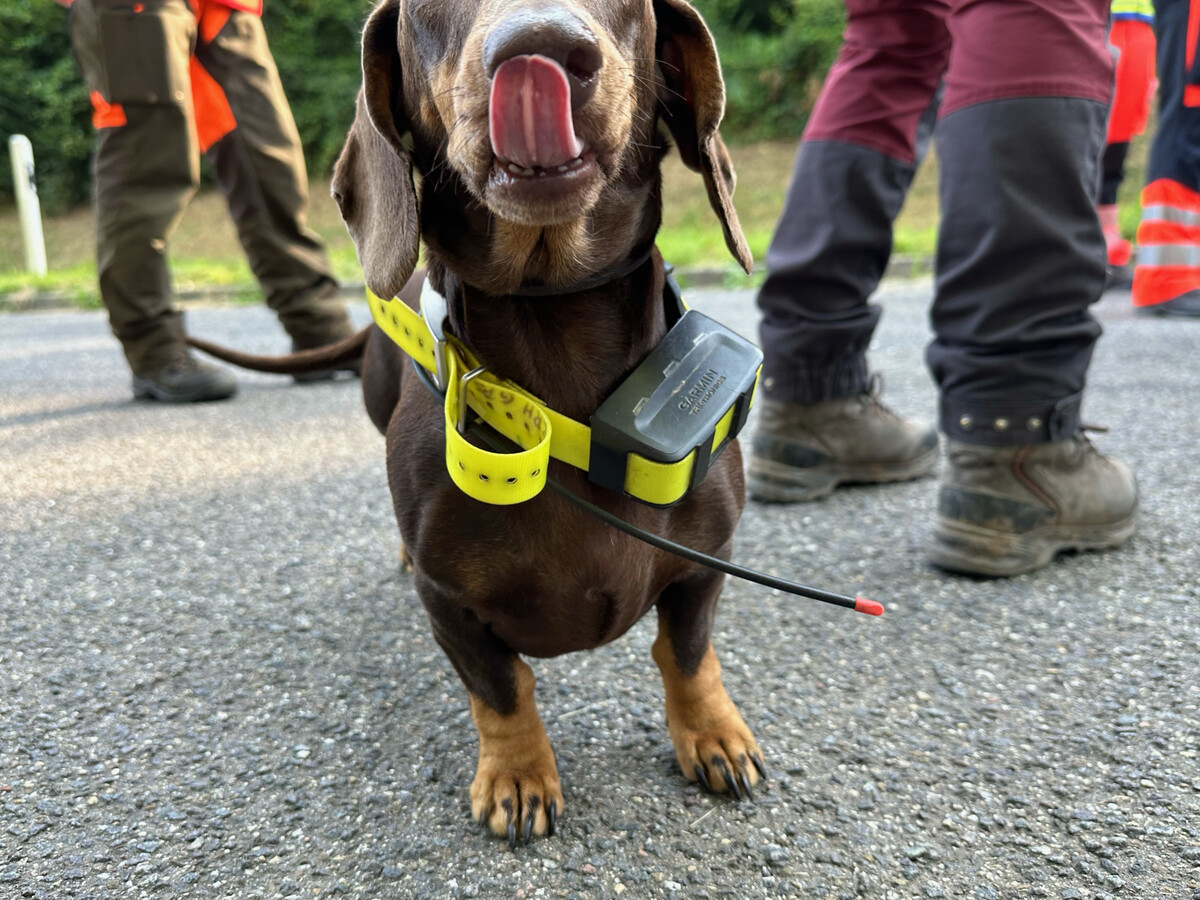 Milu kann es kaum erwarten. Seit wenigen Minuten hat ihr Frauchen die Schleppleine angebracht. Ein sicheres Zeichen für die fünfjährige Dackeldame, dass die Arbeit ruft. Gemeinsam mit ihrer Besitzerin Sandra Rapp und Uwe Deißler, dessen Hündin Rosa gerade Pause hat, geht es los in den Wald. Deißler hat den Blick fest auf dem GPS-Gerät und Sandra Rapp auf ihrem Tier, das freudig voran läuft. Die Nase von Milu ist eng am Boden. Die frisch aufgewühlte Erde einer Wildschweinrotte die vor nicht all zu langer Zeit die kleine Senke am Bach aufgesucht hat, hat der Dackel sofort im Visier. Akribisch wird jeder Zentimeter abgeschnüffelt. Für einen kurzen Moment zeigt sie an, entscheidet dann aber, dass hier weder Kadaver noch ein krankes Schwein liegen.