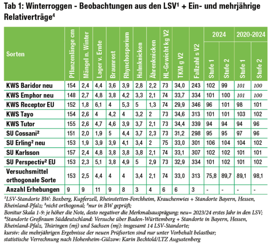 Die Neuzulassung SU Erling stößt im ersten Prüfjahr mit 106 % (V1) und 104 % (V2) in neue Ertragsdimensionen vor (BSL 9/9). Die Standfestigkeit ist gut, die Resistenzeigenschaften liegen im Mittelfeld. Die Sorte besticht 2024 mit einem sehr guten HL-Gewicht. Negativ fällt die Sorte durch einen hohen Mutterkornbefall in Boxberg auf.