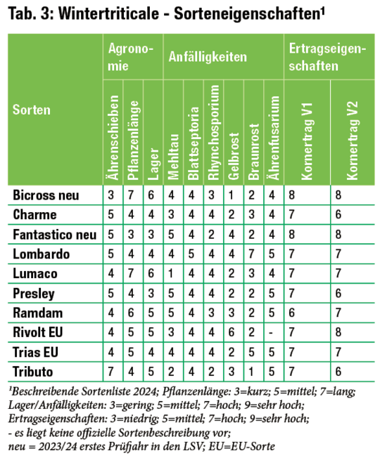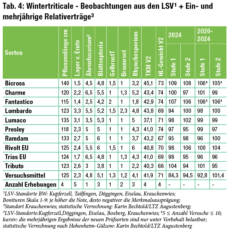 Die LSV-Wintertriticale wurde über fünf baden-württembergische Standorte verrechnet. Auch die Triticale verliert im Vergleich zu 2023. Die Durchschnittserträge bewegen sich weit unter Vorjahresniveau und lagen unbehandelt bei 84 dt/ha (2023: 105 dt/ha) und behandelt bei 95 dt/ha (2023: 118 dt/ha). Wie schon beim Winterroggen konnte der Standort Kupferzell mit den höchsten Erträgen punkten (95 dt/ha V1; 108 dt/ha V2). 'Verlierer' war auch hier der Standort Krauchenwies: Mit 75 dt/ha (V1) und 87 dt/ha (V2) liegt der Ertrag in beiden Varianten etwa 40 dt/ha hinter den Ertragsleistungen von 2023, verursacht durch heftige und anhaltende Niederschläge. Das TKM erzielt 42 g, das HL-Gewicht kommt mit 70,7 kg nur knapp über die Anforderung des Handels (70 kg).