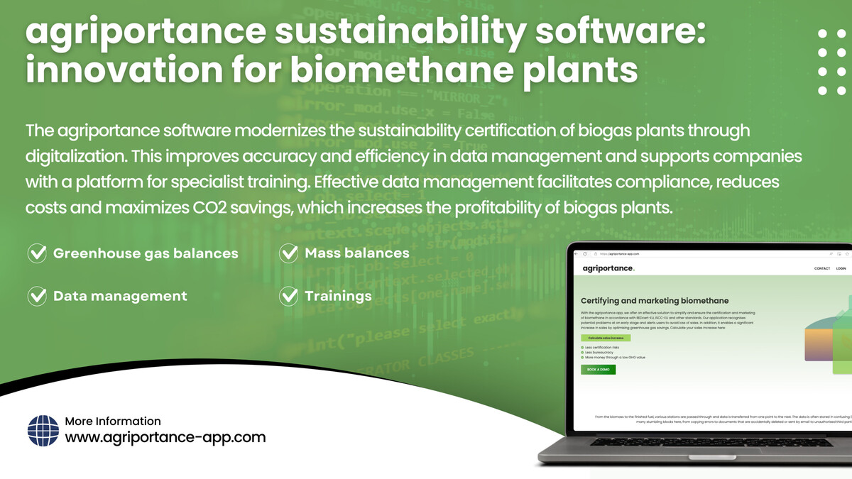 Die agriportance Software schafft hier nun Abhilfe durch eine vereinfachte Erfassung und Berechnung in der Bilanzierung von Treibhausgasen oder Massen. Insbesondere können Daten aus verschiedenen Formaten automatisiert importiert und die entsprechenden Bilanzen gestützt auf fortschrittliche Algorithmen einfach erstellt werden. Durch den Vergleich von Standard- und individuellen Werten werde dabei stets der bestmögliche Wert gefunden, der für ein optimales Ergebnis genutzt werden kann. Das Einpflegen geänderter gesetzlicher Vorschriften oder Berechnungsgrundlagen wird vom App-Hersteller kontinuierlich übernommen, sodass die App stets auf dem aktuellen Stand ist. Zusätzlich werden Schulungen für die Nachhaltigkeitszertifizierung angeboten.