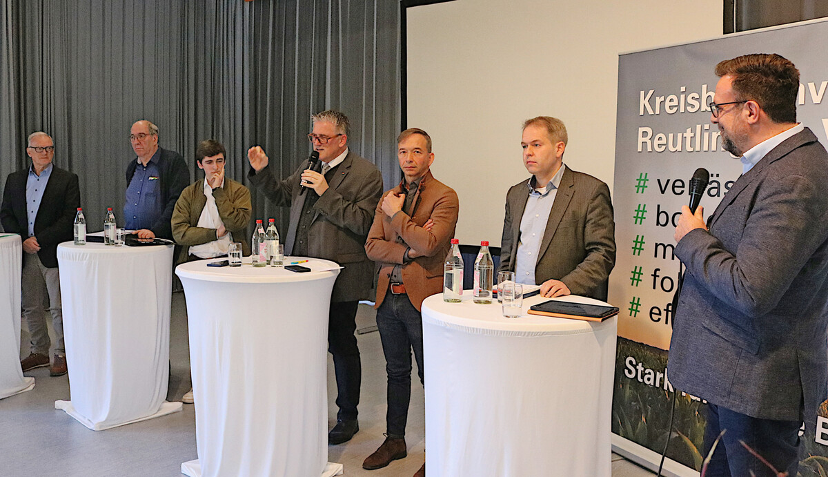 Bei der Podiumsdiskussion unter der Leitung von BWagrar-Chefredakteur Guido Krisam unterstrichen die sechs Kandidaten zur Bundestagswahl die Bedeutung der Ernährungssicherung, wenngleich der Weg dazu ganz unterschiedlich ausfällt. Rudolf Grams, AfD, und Michael Jäger, BSW, wollen hohe Produktionskosten durch niedrige Energiepreise senken. Jäger will zudem Billigimporte aus dem Ausland stoppen und die Marktmacht in der Verarbeitung und im Handel einschränken. Michael Donth, CDU, möchte die Ernährungssicherung als ein Staatsziel mit ins Grundgesetz schreiben. Und: „Wir müssen die Konzepte ändern und anpassen, so wie Felßner es gesagt hat, im Sinne der Landwirtschaft, insbesondere der kleinbäuerlichen“, so Donth. Damit stand er nicht allein: Alle Parteienvertreter machten sich für regionale Produkte und mehr Wertschöpfung in der Region stark. Die kleinteilige Landwirtschaft liefere einen wichtigen Beitrag zur Ernährungssicherung, betonte auch Pascal Kober, FDP. So brauche man zum Beispiel künftig keine pauschalen Stilllegungsflächen mehr, sondern neue ertragreiche Sorten. Für Jaron Immer, Grüne, sind die Zeiten von „Wachsen oder Weichen“ endgültig vorbei. Zur Versorgungssicherheit gehöre für ihn vor allem auch der Klimaschutz dazu, mit gesunden, fruchtbaren Böden, die Wetterextremen standhielten, um Ernteausfälle möglichst gering zu halten. Das sah Sebastian Weigle, SPD, ähnlich, der sich Sorgen wegen des Klimawandels macht. Die Bodenfruchtbarkeit müsse bei der Förderpolitik unbedingt berücksichtigt werden. Weigle setzt sich im Steuerrecht für eine Risikorücklage ein, um Einkommensausfälle auszugleichen. Zum Stichwort Bürokratieabbau meinte Pascal Kober, FDP, dass der deutschen Landwirtschaft wegen bundesrechtlicher Dokumentation jährlich allein 430 Millionen Euro verloren gingen. Geld, das die Betriebe gut gebrauchen könnten, meinte er weiter.