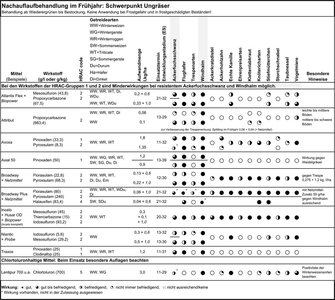 Bei der Unkrautbekämpfung ist die Behandlung auf die ertragswirksamen Arten zu beschränken: Im Vordergrund steht die Bekämpfung von Ungräsern, da hier mit starken Ertragsdepressionen zu rechnen ist und eine hohe Folgeverunkrautung sowie das Auftreten von Resistenzen zu einem erhöhten Aufwand führen. Weitere dominante Unkräuter können zum Beispiel Klettenlabkraut oder Kamille sein, bei denen Schadschwellen für die Entscheidung über eine Herbizidmaßnahme gelten. Unkräuter, die standorttypisch als weniger ertragsrelevant einzustufen sind, wie der Ehrenpreis, können toleriert werden. Bei der Unkrautbekämpfung im Frühjahr steht nach wie vor die Gräserbekämpfung im Vordergrund. Auch wenn bereits im Herbst eine Unkrautbekämpfung durchgeführt...
