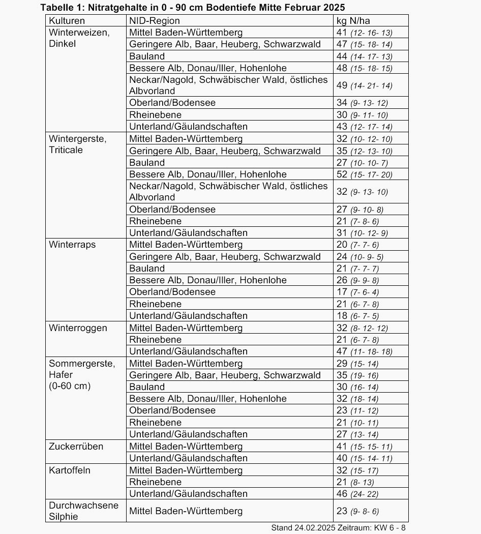 Durch die NID-Vorproben der Landwirtschaftsämter können bereits erste Werte zu den geplanten Sommerungen (ohne Mais) berichtet werden. Auf diesen Flächen wurde in einer Tiefe bis 60 cm ein Nitratgehalt von 29 kg N/ha (Verteilung: 15 - 14 kg N/ha) gemessen. Für tiefwurzelnde Sommerungen, wie z.B. Zuckerrüben, sind die Werte (einschließlich der dritten Schicht) aus der nachstehenden Tabelle zu verwenden. Bei Hafer, der im Gegensatz zur Sommergerste bis zu 90 cm tief durchwurzelt, bitte zusätzlich 10 kg N je ha für die 3.