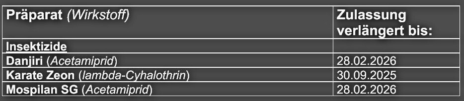 Das Bundesamt für Verbraucherschutz und Lebensmittelsicherheit hat die Zulassung von Pflanzenschutzmitteln, deren Zulassung durch Zeitablauf endete, verlängert. Die Zulassungsverlängerungen werden bis zur endgültigen Entscheidung über eine erneute Zulassung erteilt.