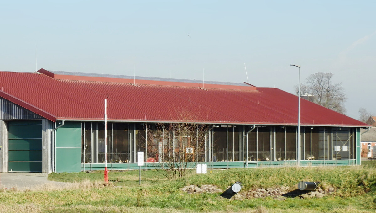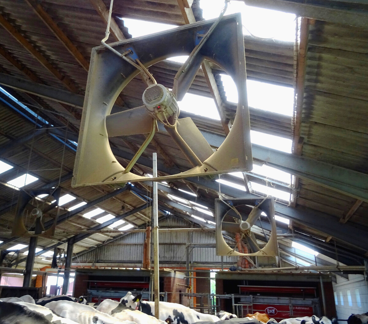 Die Trauf-First-Lüftung funktioniert wegen der Temperaturunterschiede zwischen innen und außen. An warmen und windstillen Tagen kommt die freie Lüftung über die Thermik oft zum Erliegen, wodurch die Tiere ihre produzierte Wärme kaum noch an die Umgebung abgeben können. In solchen Fällen ist es häufig sinnvoll, die Wärmeabgabe durch Ventilatoren zu fördern, um das Wärmepolster auf der Haut zu durchbrechen.
