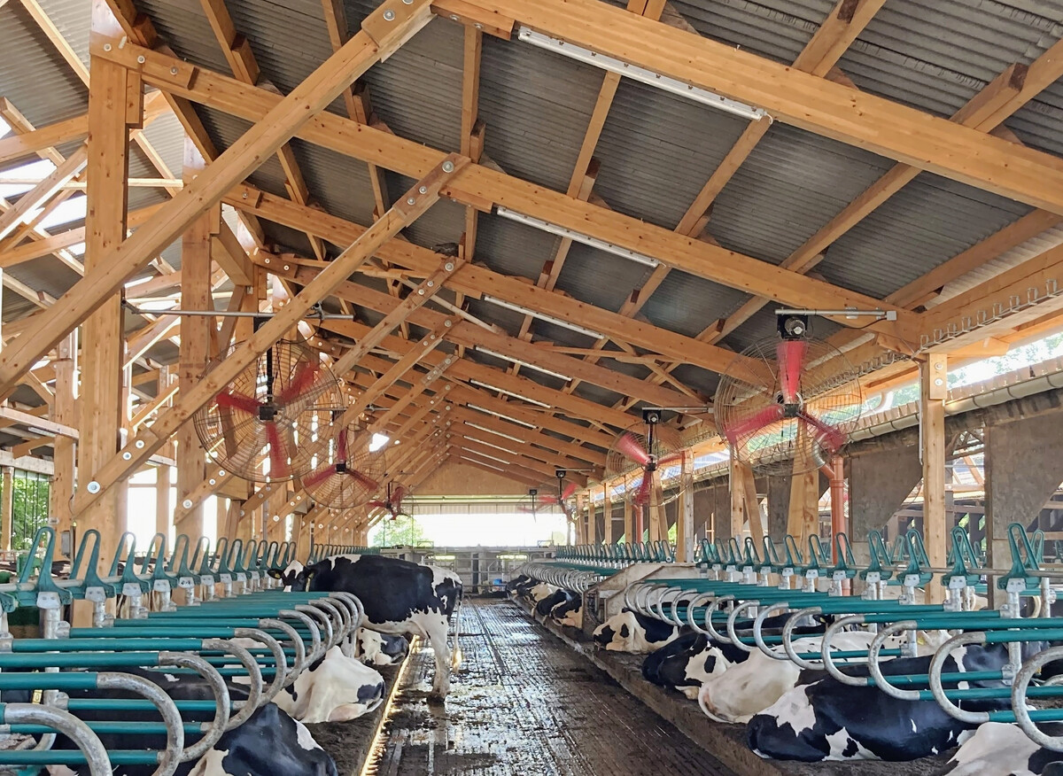1In Milchviehställen wird die Luftgeschwindigkeit und damit der Luftaustausch durch den Einsatz von Ventilatoren erhöht. Luftgeschwindigkeiten von über 2,0 m pro s bewirken einen Kühlungseffekt und eine Verringerung der Wärmebelastung bei den Tieren. Das ist besonders wichtig für "verbaute" und ältere Ställe, bei denen die natürliche Belüftung bereits bei niedrigen Temperaturen nicht ausreicht. In vielen Fällen sind die Kosten für Technik und Strom oft niedriger als der Nutzen allein durch die höhere beziehungsweise nicht abgefallene Milchleistung. Bei Neubauten sollten auch die Möglichkeiten der Wärmedämmung des Stalldaches in Betracht gezogen werden.