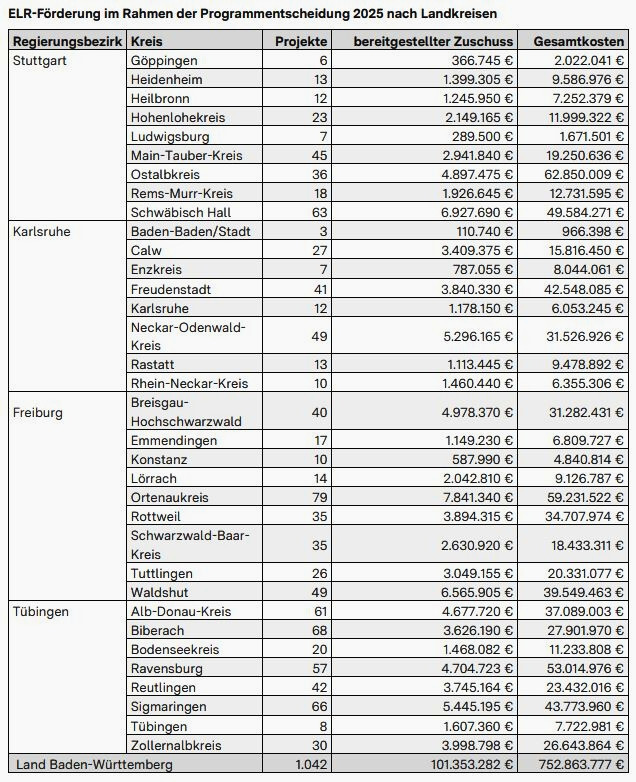 „Mit dem Entwicklungsprogramm Ländlicher Raum (ELR) adressieren wir die zentralen Zukunftsfragen für eine hohe Lebensqualität im Ländlichen Raum: Attraktives Wohnen in lebendigen Gemeinden, eine gesicherte Grundversorgung, die Möglichkeit sich in gemeinschaftliche Aktivitäten einzubringen sowie interessante Arbeitsplätze in einer wirtschaftlich starken Region. Ich bin deshalb sehr froh, dass wir als Land 2025 unsere Kommunen wieder mit dem Entwicklungsprogramm Ländlicher Raum unterstützen. Insgesamt fördern wir dieses Jahr 1042 Projekte mit 101,4 Millionen Euro in 410 Gemeinden. Mit dem ELR setzen wir damit in diesem Jahr erneut starke Impulse für einen starken Ländlichen Raum“, sagte der Minister für Ernährung, Ländlichen Raum und Verbraucherschutz, Peter Hauk MdL, am Freitag (7. März) anlässlich der diesjährigen Bekanntgabe der ELR-Programmentscheidung in Stuttgart.
