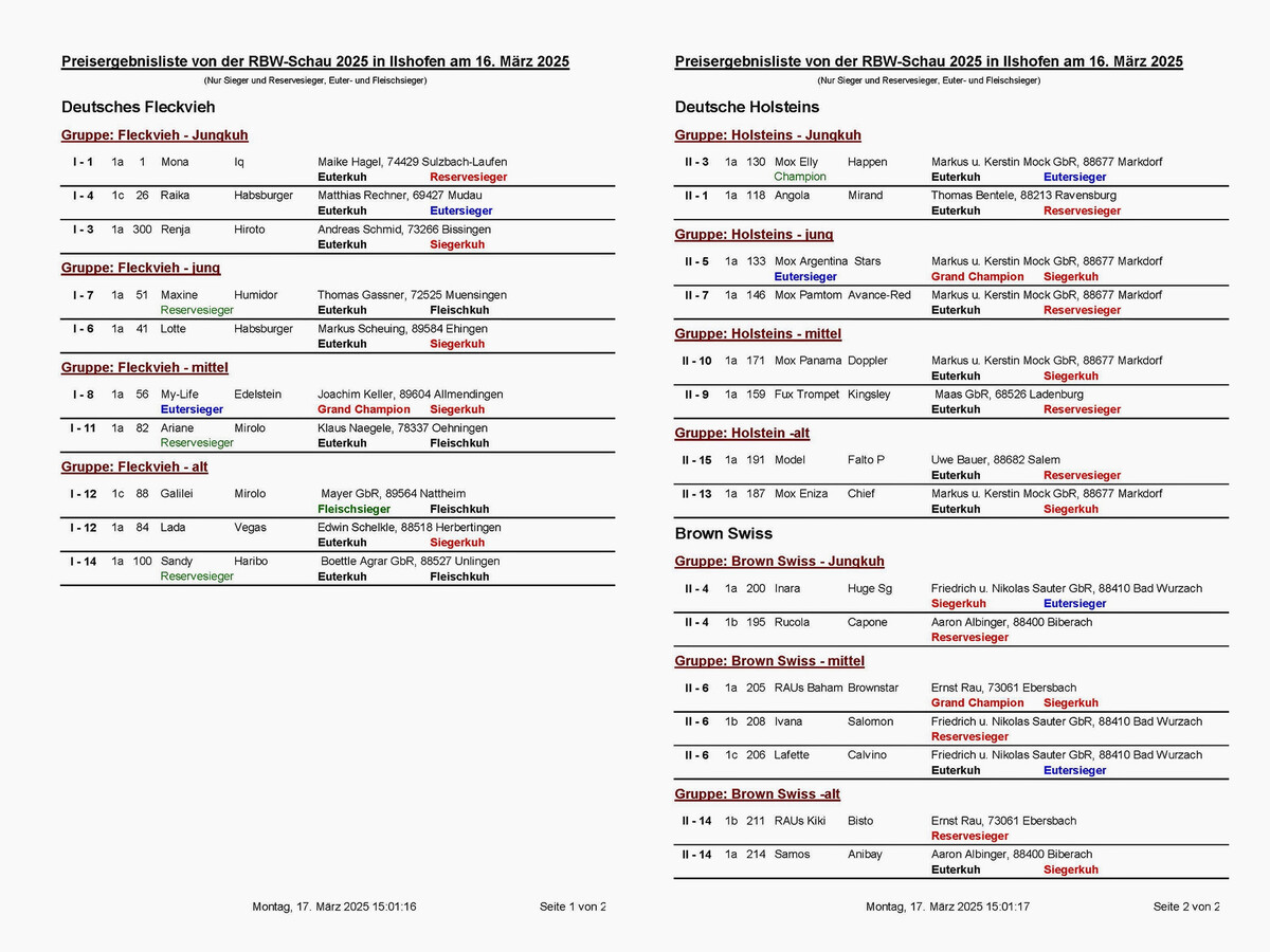 Die Wahl zur Eutersiegerin Holsteins fiel auf die unglaublich harmonische Euterkuh Stars Argentina, die damit die Grundlage für ihre Wahl zum Grand Champion legte und somit den Titel des Grand Champions erneut für den Betrieb Mock GbR aus Markdorf sicherte. Damit zeigte das Ergebnis Holsteins mit dem Betrieb Markus und Kerstin Mock aus Markdorf zwar einen klaren Gewinner, allerdings waren die Einzelklassen zum Teil eng und hochwertig besetzt.