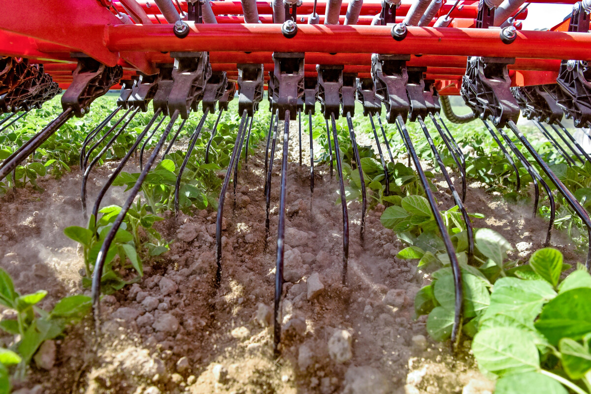 Aufgrund der Unkrautkonkurrenz in der Jugendentwicklung sind mehrere Striegel- oder Hackgänge notwendig. Das richtige Gerät mit der optimalen Einstellung zum richtigen Zeitpunkt einzusetzen, ist die Herausforderung bei der mechanischen Bekämpfung. In der Praxis hat sich eine Kombination aus Striegeln und mehrmaligem Hacken bewährt. Bei einer gleichmäßigen Saattiefe von 4 cm und warmer Witterung kann ab dem 4. Tag nach der Saat ein Striegeleinsatz erfolgen - das sogenannte „Blindstriegeln“. Zu diesem Zeitpunkt sollten die Keimlinge gerade Wurzeln ausbilden (sich sozusagen „verankern“), aber noch nicht aufgelaufen sein! Je nach Striegelintensität sind mindestens zwei weitere Hackdurchgänge erforderlich. Der erste Hackdurchgang zwischen den Reihen sollte so früh wie möglich während des Auflaufens erfolgen. Weitere Hackdurchgänge sind in der Regel innerhalb der ersten 4 bis 6 Wochen nach der Aussaat erforderlich. Um die Unkräuter gezielt in der Reihe zu treffen, sind Fingerhacken und Flachhäufler besonders geeignet. Zu starkes Hacken kann zu Ernteverlusten führen. Der letzte Hackdurchgang erfolgt zum letztmöglichen Zeitpunkt vor Reihenschluss.