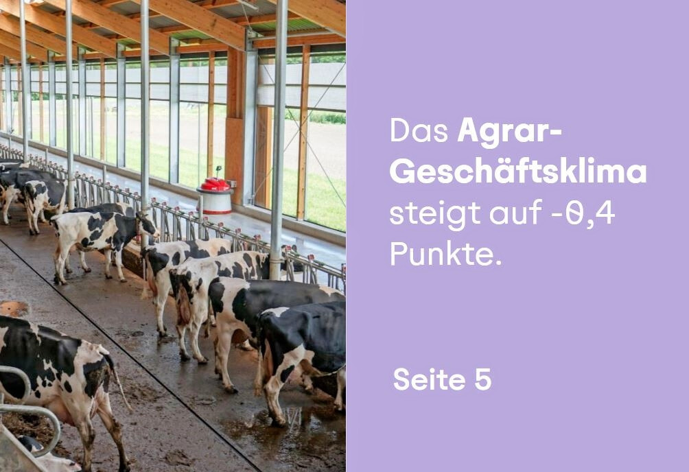 Das Agrar-Geschäftsklima hat sich gegenüber der letzten Befragung im Winter 2024 von minus 1,2 Punkten auf nun minus 0,4 Punkte deutlich verbessert. Der Wert errechnet sich aus den Zukunftserwartungen landwirtschaftlicher Betriebe und der Einschätzung der aktuellen Lage. Rund ein Drittel der befragten Landwirte will ihren Betrieb durch Diversifizierung auf eine breitere Basis stellen und plant in den nächsten zwei bis drei Jahren entsprechende Veränderungen in den Betriebszweigen. Vor allem sollen die Bereiche Fotovoltaik und Ackerbau ausgebaut werden. Gleichzeitig will knapp ein Fünftel der Tierhalter auf eine höhere Haltungsform umstellen.