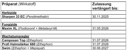 Die Zulassungsverlängerungen werden bis zur endgültigen Entscheidung über eine erneute Zulassung erteilt. Die betroffenen Mittel sind in der Tabelle aufgeführt.