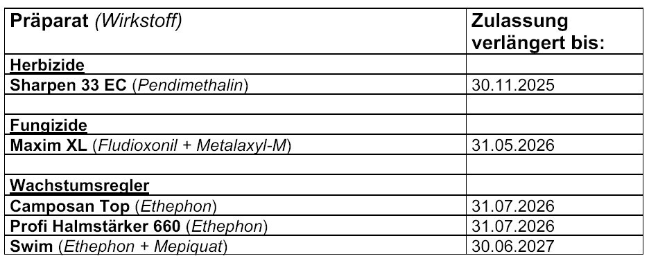 Das Bundesamt für Verbraucherschutz und Lebensmittelsicherheit hat die Zulassung von Pflanzenschutzmitteln, deren Zulassung durch Zeitablauf endete, verlängert.