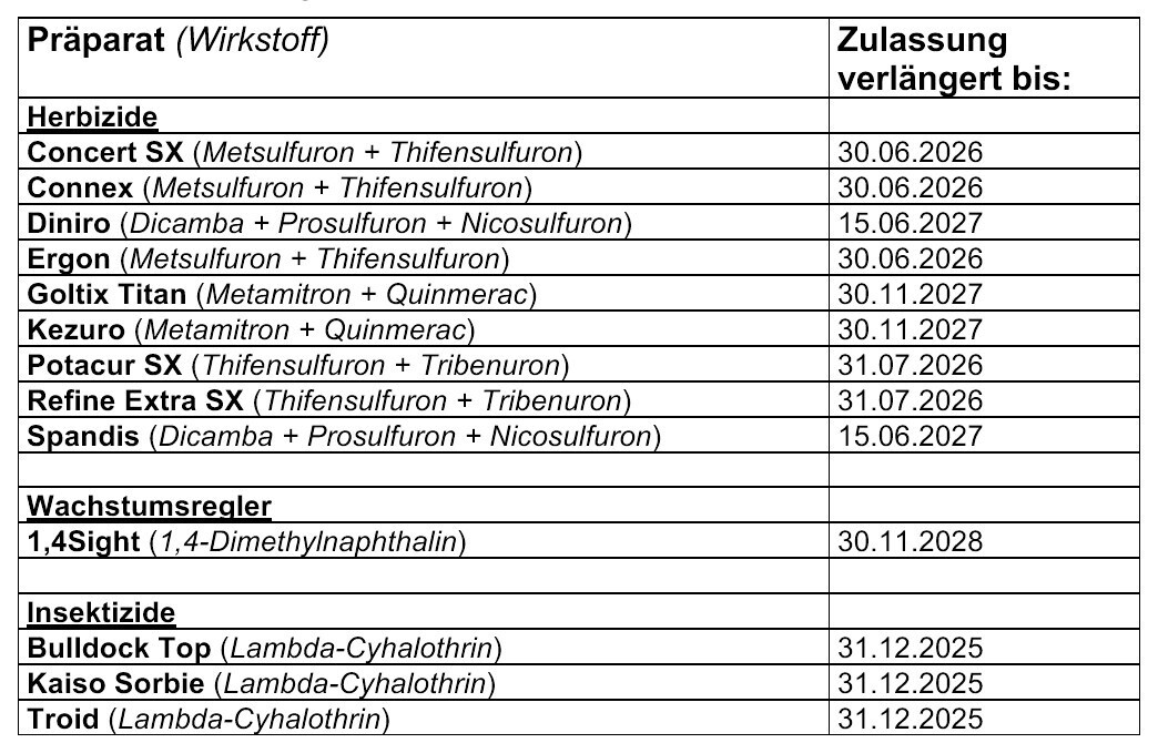 Das Bundesamt für Verbraucherschutz und Lebensmittelsicherheit hat die Zulassung von Pflanzenschutzmitteln, deren Zulassung durch Zeitablauf endete, verlängert.