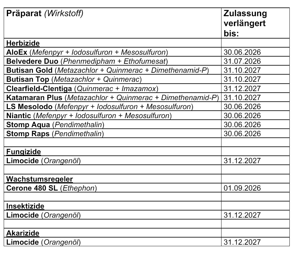 Das Bundesamt für Verbraucherschutz und Lebensmittelsicherheit hat die Zulassung von Pflanzenschutzmitteln, deren Zulassung durch Zeitablauf endete, verlängert. Die Zulassungsverlängerungen werden bis zur endgültigen Entscheidung über eine erneute Zulassung erteilt.