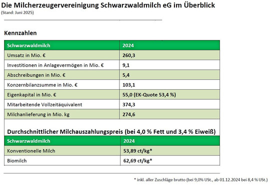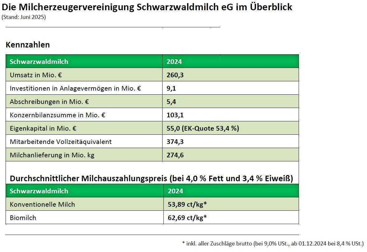 Der Umsatz konnte im Jahr 2024 um knapp 5 Prozent beziehungsweise 12,1 Mio. Euro auf 260,3 Mio. Euro gesteigert werden. Der strategische Kern, das Markensortiment wuchs dabei deutlich um 9 Prozent. Es wurden in Summe 9,1 Mio. Euro in die beiden Standorte Freiburg und Offenburg investiert und die Eigenkapitalquote liegt nun bei 53,4 Prozent. Im Jahr 2024 wurden 274,6 Mio. kg Milch angeliefert – der durchschnittliche Milchauszahlungspreis lag für konventionelle Milch bei brutto 53,89 ct/kg (inkl. aller Zuschläge, bei 9,0 % USt., ab 01.12.2024 bei 8,4 % USt.) beziehungsweise für Biomilch bei brutto 62,69 ct/kg (inkl. aller Zuschläge).