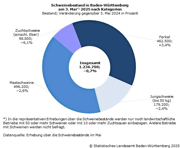 Am 3.?Mai 2025 wurden nach Angaben des Statistischen Landesamtes 1,24?Millionen Schweine in Baden-Württemberg gehalten. Damit lag der Bestand mit einem leichten Rückgang von einem Prozent (%) auf dem Niveau der vergleichbaren Erhebung im Mai 2024. Während in den Jahren 2022?(minus 10?%) und 2023?(minus 6?%) noch deutlich höhere Rückgänge zu verzeichnen waren, konnte im vergangenen (minus 2?%) und in diesem Jahr eine Stabilisierung des Bestandes festgestellt werden. Auch die Abnahme der Schweine haltenden Betriebe war mit einem Minus von 2?% auf nun 1?460 weniger stark als zu den vorangegangenen Jahren 2024 (minus 3?%) und 2023?(minus 10?%).
