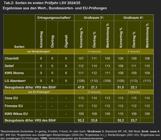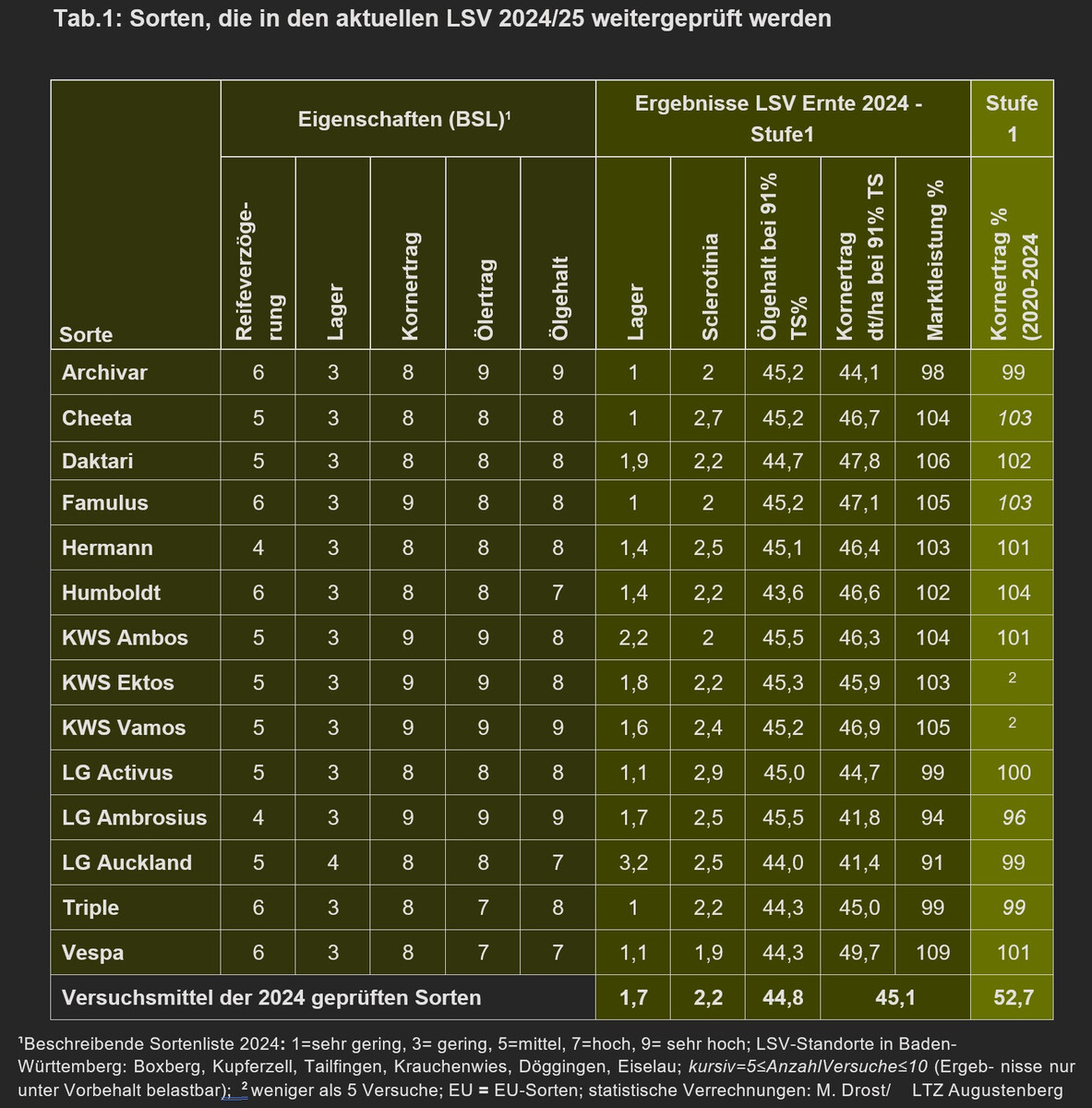 Bei keiner Kultur ist die Spanne zwischen Ernte und neuer Aussaat so eng wie bei Winterraps. Zum Zeitpunkt der Sortenwahl und Saatgutbestellung liegen in der Regel die aktuellen Ergebnisse der Prüfsorten noch nicht vor. Als Entscheidungshilfe für die Praktikerinnen und Praktiker werden deshalb die Vorjahresergebnisse der Landessortenversuche sowie die mehrjährigen Ergebnisse dargestellt. Wichtige Kriterien bei der Sortenwahl sind Ertrags- und Qualitätseigenschaften und die daraus resultierende Marktleistung. Als anbauwürdig gilt eine Sorte, die auch unter schwierigen saisonalen Bedingungen und mehrjährig ertragsstabil, standfest und gesund ist. Maßgebend für die Beurteilung der Sorten und ihrer Eigenschaften in den Landessortenversuchen ist die mehrfach wiederholte reduzierte Variante (V1), das heißt weitestgehender Verzicht auf Pflanzenschutzmaßnahmen wie Wachstumsregler und Fungizide sowie Insektizide nur bei Überschreiten der Bekämpfungsrichtwerte. Die nachfolgenden Sortenbeschreibungen beschränken sich auf die Sorten, die diesjährig zur Weiterprüfung anstehen. In den aktuellen Landessortenversuchen werden insgesamt 21 Winterrapssorten an sechs Standorten geprüft. Die Ergebnisse werden zeitnah in den Fachmedien und auf der Homepage des Landwirtschaftlichen Technologiezentrums Augustenberg (LTZ) veröffentlicht.