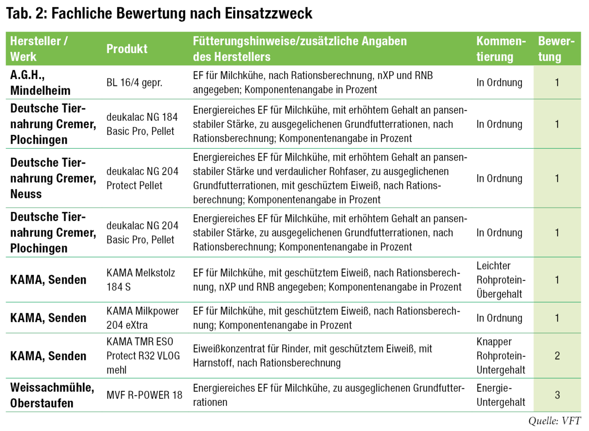 Von den Mischfuttern zur Ergänzung nach Leistung fiel beim Rohproteingehalt das Produkt „KAMA Melkstolz 184 S“ (von kama, Senden) mit leichtem Übergehalt auf (20,0 % XP getestet, 18 % deklariert). Die Abweichungen lagen aber innerhalb der futtermittelrechtlich akzeptierten Toleranz. Der Einsatz geschützter Proteine konnte der Deklaration bei vier der sieben Milchleistungsfuttern entnommen werden. Futterharnstoff war in keinem der getesteten Futter enthalten.