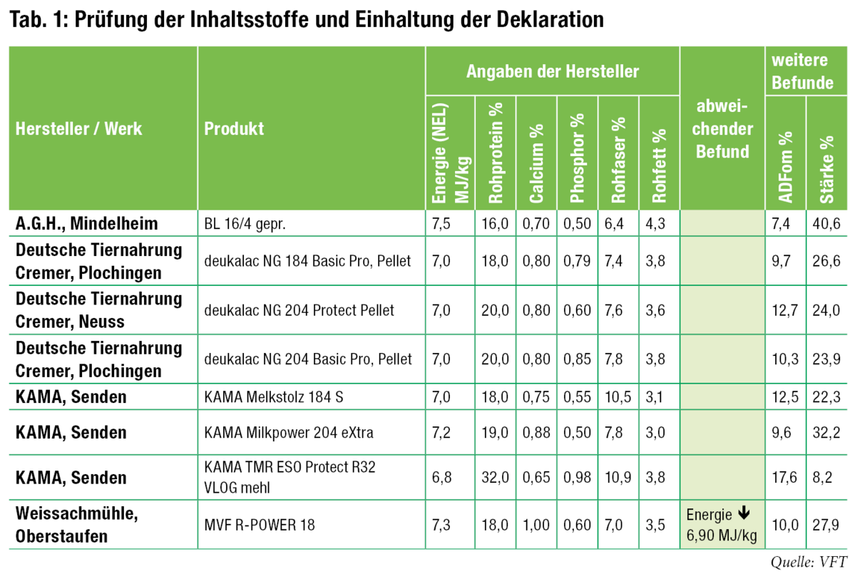 Die getesteten Futtermittel wurden hinsichtlich ihres Energiegehalts (NEL) und der Gehalte an Trockenmasse, Rohprotein, Rohfaser, Rohfett, Rohasche, Calcium, Phosphor sowie Stärke und ADFom überprüft. Im Mischfuttertest werden neben der Einhaltung der futtermittelrechtlichen Deklarationsvorgaben (Deklarationsprüfung) für die fachliche Bewertung auch rechtlich nicht relevante Abweichungen vom angegebenen Nährstoff- und Energiegehalt bewertet. In die fachliche Bewertung fließen darüber hinaus die Aussagekraft der Einsatzempfehlung und das Einhalten fachlicher Anforderungen ein. Sechs der getesteten Futtermittel wurden mit der Note 1 bewertet. Je einmal wurde die Note 2 und die Note 3 vergeben.
