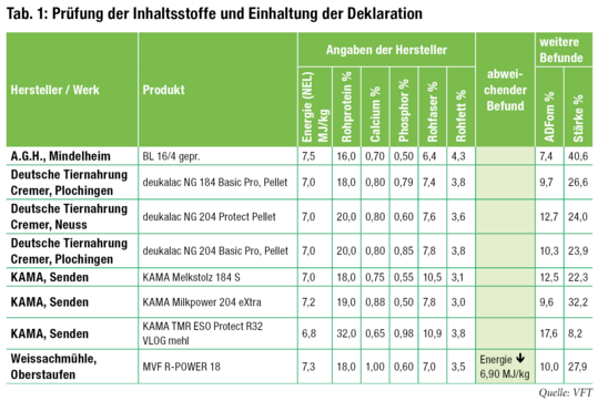 Die Prüfung auf Einhaltung der Deklaration nach futtermittelrechtlichen Vorgaben ergab für sieben Mischfuttermittel eine Übereinstimmung mit den Angaben zum Energiegehalt. Bei einem Produkt (“MVF R-POWER 18“ von der Weissachmühle, Oberstaufen) lag die Herstellerangabe zum Energiegehalt (7,3 MJ NEL pro kg) deutlich über dem analysierten Gehalt (6,9 MJ NEL pro kg). Die Abweichung war größer als futtermittelrechtlich erlaubt und hatte deshalb Konsequenzen für die Bewertung (Note 3). Die Gehalte an Rohprotein, Rohfett, Rohfaser sowie Phosphor und Calcium waren auf allen Produkten rechtlich korrekt deklariert.
