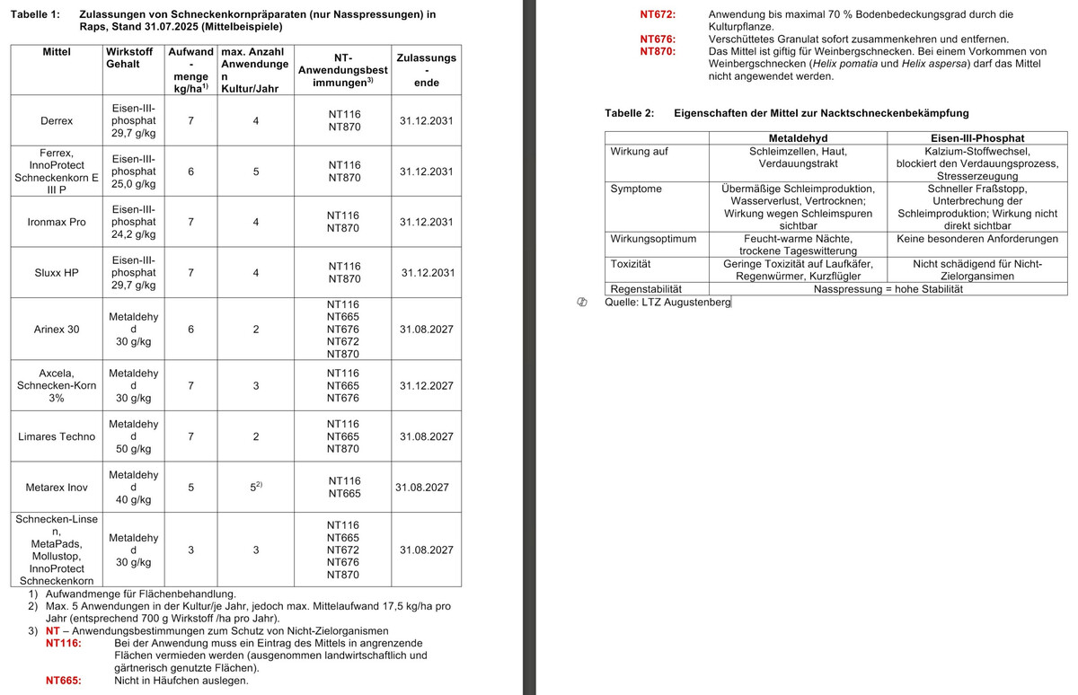 Hier muss eine Kontrolle der Winterrapsflächen an mindestens zwei Stellen pro Bewirtschaftungseinheit (nicht im Randbereich) unmittelbar vor und/oder nach der Saat auf das Vorkommen von Nacktschnecken mit den oben beschriebenen Methoden durchgeführt und dokumentiert werden. Um ein Einwandern von Schnecken aus angrenzenden Flächen zu verhindern, ist eine Teilbehandlung im Randbereich auch ohne Überwachung zulässig.