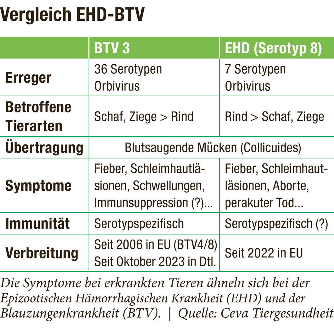 Nachdem sich der Erreger der epizootischen hämorrhagischen Krankheit (EHDV-8) seit dem Herbst 2023 im benachbarten Frankreich stark ausgebreitet hat – allein zwischen Juni vergangenen Jahres und dem Mai dieses Jahres gab es dort 3800 Ausbrüche – steigt nun auch in Deutschland die Sorge vor einem Ausbruch. Bei EHD handelt es sich um eine vektorübertragene Viruserkrankung, die vor allem Rinder betrifft. Sie wird durch Gnitzen (kleine Mücken der Gattung Culicoides) übertragen, also dieselben, die die Blauzungenkrankheit übertragen, erläuterte Katharina Bente von dem Düsseldorfer Pharmaunternehmen Ceva Tiergesundheit bei einem Seminar, das sich Ende Juni zahlreiche online zugeschaltete Zuhörer nicht entgehen lassen wollten. Als Überträger kommen zehn Arten der Gnitzen in Frage, darunter die Gattung Culicoides obsoletus, die durch die größte Krankheitswahrscheinlichkeit (Prävalenz) – auch für Nordeuropa – auffällt.