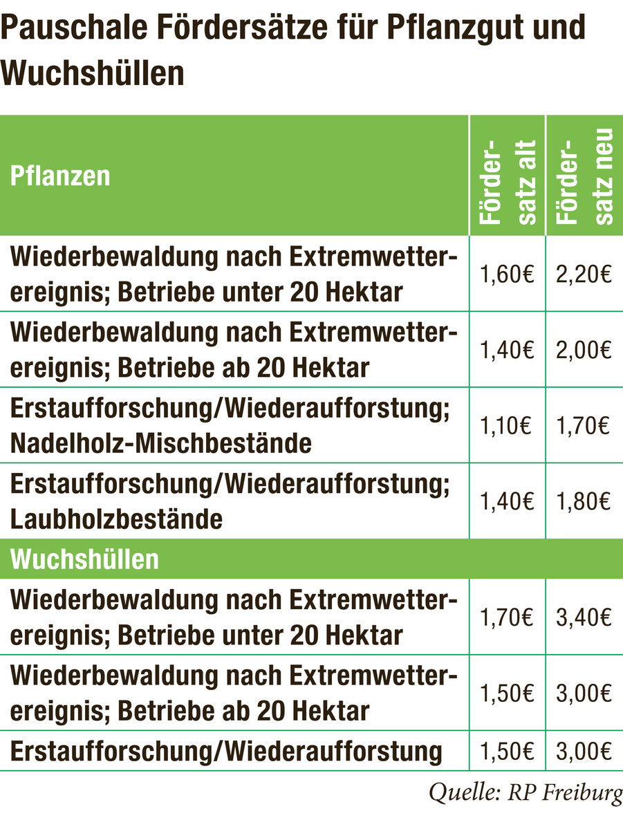 Eine weitere für die Waldbesitzerinnen und Waldbesitzer erfreuliche Nachricht dürfte die zum Teil deutliche Anhebung der Fördersätze für Pflanzgut, Pflanzung und Wuchshüllen im Bereich der Wiederbewaldungsmaßnahmen sein. Je nach Forstbetriebsgröße und Laubholzanteil der Wiederaufforstungsfläche wurde der pauschale Fördersatz je Pflanze um 40 bis 60 Cent angehoben. Bei Wuchshüllen entspricht die Erhöhung um 1,50 Euro beziehungsweise 1,70 Euro je Wuchshülle sogar einer Verdoppelung der Fördersätze. Seit 1. Januar 2024 ist die Verwendung von plastikfreien Wuchshüllen im Wald obligatorisch. Da diese jedoch zumeist teurer als konventionelle Wuchshüllen sind, kommt die Forstliche Förderung hier den Waldbesitzenden entgegen.