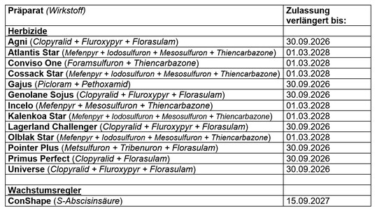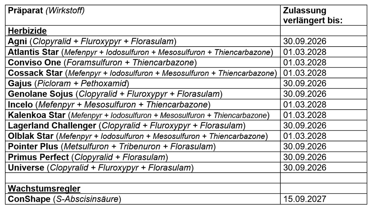 Das Bundesamt für Verbraucherschutz und Lebensmittelsicherheit hat die Zulassung von Pflanzenschutzmitteln, deren Zulassung durch Zeitablauf endete, verlängert. Die Zulassungsverlängerungen werden bis zur endgültigen Entscheidung über eine erneute Zulassung erteilt.
