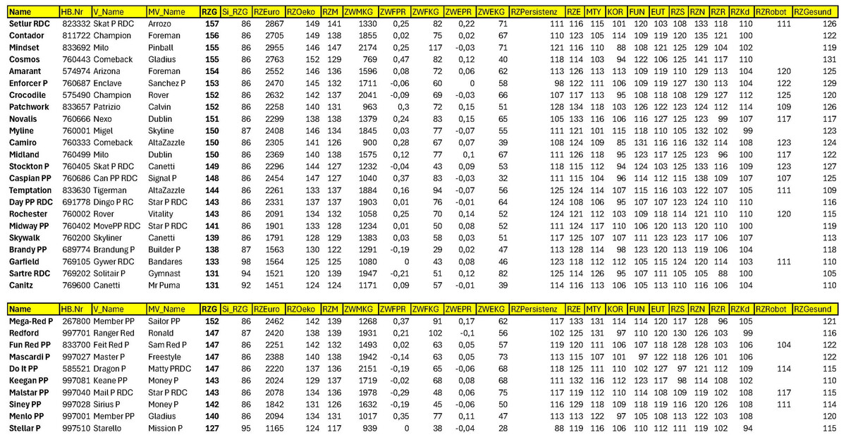 Bei den Rotbunten führt Ginger mit 143 RZG die Wiedereinsatzliste an. Die etablierten Groovy P (Gywer RDC*Powerball P, RZG 129) und Stellar P (Starello*Mission P, RZG 127) bestätigen ihre Stärken und bleiben sichere Empfehlungen.