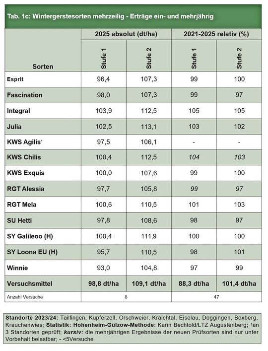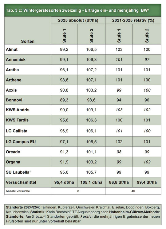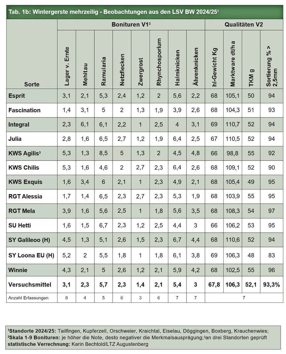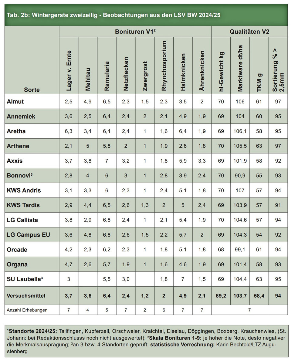 Die zweizeiligen (zz) und mehrzeiligen (mz) Wintergersten werden in Baden-Württemberg in getrennten Landessortenversuchen an acht Standorten geprüft. Zusätzlich steht in St. Johann das zweizeilige Prüfsortiment. Die Landessortenversuche (LSV) sind zweifaktoriell aufgestellt: In der reduzierten Variante 1 (V1) wird auf Fungizide und Wachstumsregler verzichtet, in der integrierten Variante 2 (V2) wird ortsüblich nach Bekämpfungsrichtwerten behandelt. Aussaatstärke, Düngung und Pflanzenschutz werden bei der Bestandesführung der Zeiligkeit entsprechend angepasst.
