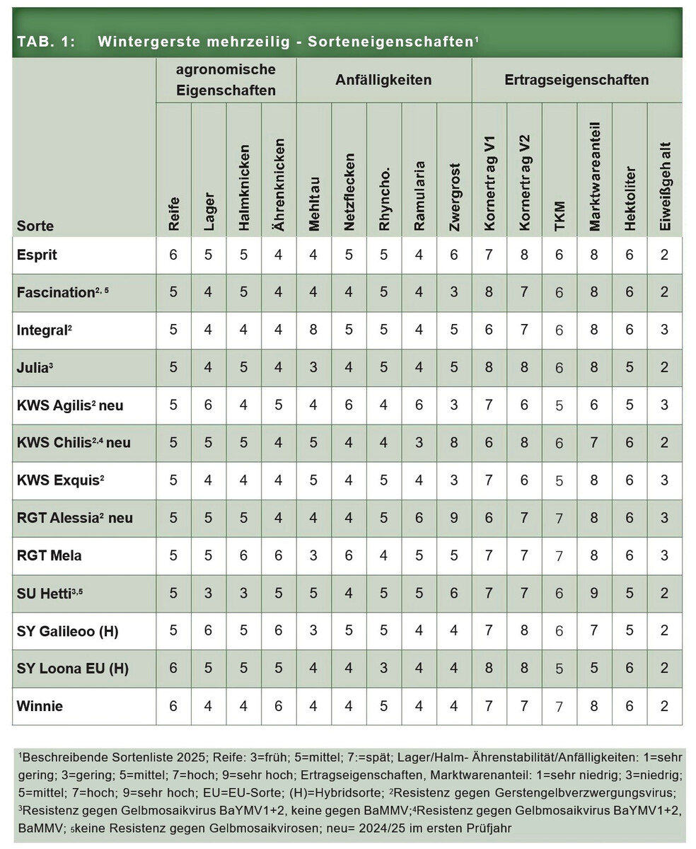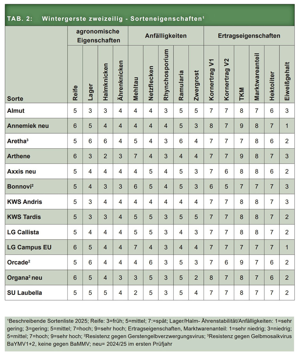 Hier sind die empfohlenen Sorten für den Anbau in den Jahren 2025 und 2026. Mehrzeilige Gerste:
