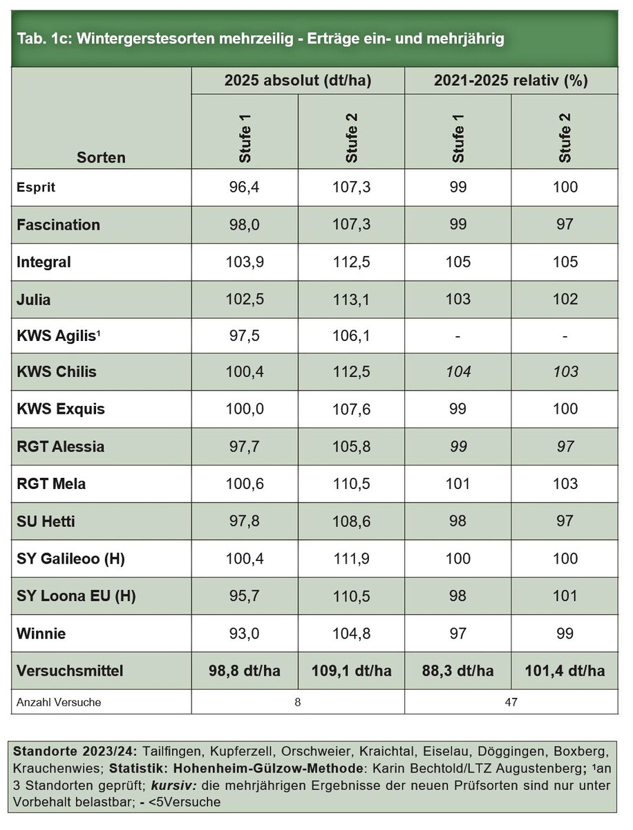 Das Ertragsmittel der mehrzeiligen Gersten, ebenfalls mit 13 Prüfkandidaten, erreicht 99 Dezitonnen pro Hektar (Variante 1) und 109 Dezitonnen pro Hektar (Variante 2). Auch in diesem Sortiment liegt Döggingen mit beachtlichen 113 Dezitonnen pro Hektar (Variante 1) und 126 Dezitonnen pro Hektar (Variante 2) an der Spitze. Die Erntesieger kommen ebenfalls aus Döggingen und sind mit 120 Dezitonnen pro Hektar (Variante 1) und 134 Dezitonnen pro Hektar (Variante 2) die Sorte Integral (mehrzeilig) und mit 114 Dezitonnen pro Hektar (Variante 1) und 121 Dezitonnen pro Hektar (Variante 2) die Sorte Annemiek (zweizeilig).