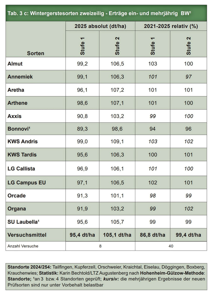 Die Erträge der Landessortenversuche sind im Jahr 2025 in beiden Prüfsortimenten deutlich höher als im Vorjahr. Bei über acht Prüfstandorten und 13 Sorten kommt die zweizeilige Gerste auf einen Durchschnittsertrag von 95 Dezitonnen pro Hektar (Variante 1) und 105 Dezitonnen pro Hektar (Variante 2). Der ertragsstärkste Standort ist Döggingen mit 104 Dezitonnen pro Hektar (Variante 1) und 117 Dezitonnen pro Hektar (Variante 2).