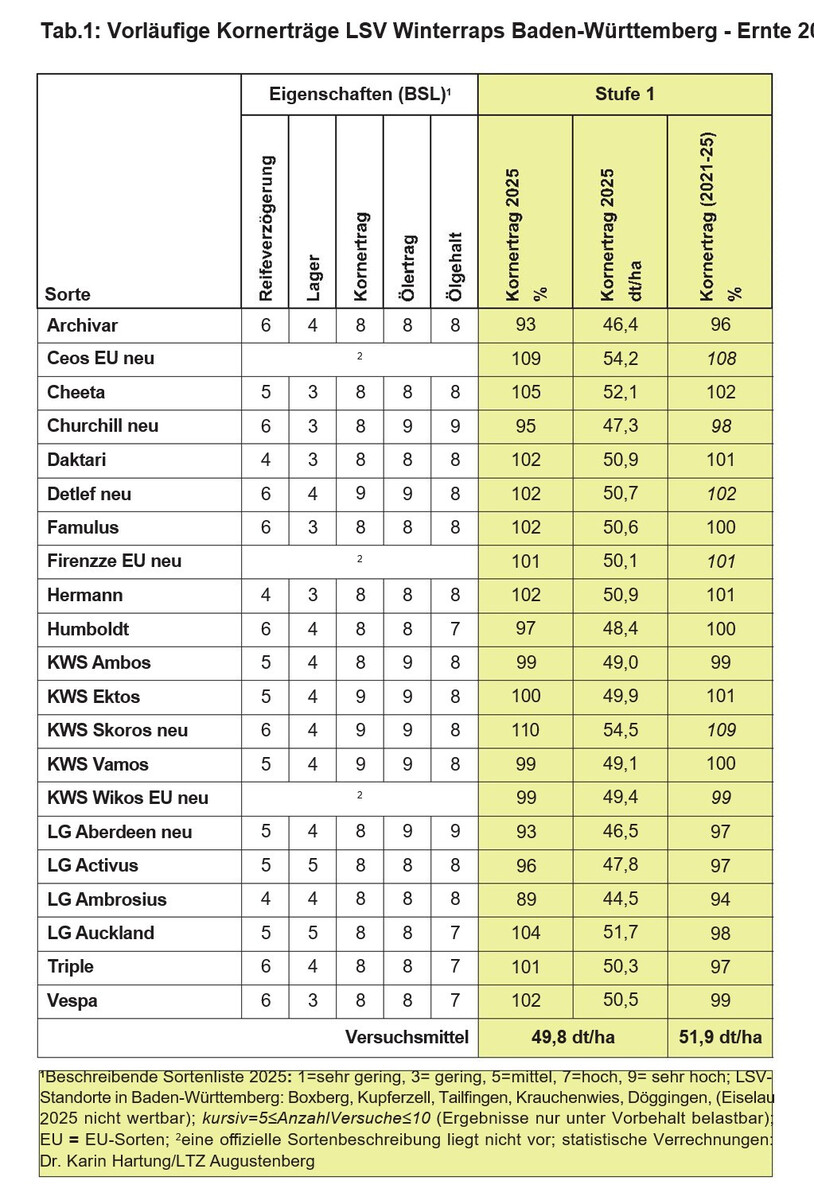 Die diesjährige Ernte des Landessortenversuchs (LSV) Winterraps zog sich aufgrund einer langanhaltenden Regenperiode über vier Wochen hin: Am 18. Juli wurde mit Boxberg der erste Standort beerntet, die abschließende Ernte erfolgte am 13. August in Eiselau. Fünf der sechs baden-württembergischen Versuche kamen in die Auswertung. Schwankungen der Parzellenerträge, zum Beispiel aufgrund von Verlusten durch Hagel, waren in Eiselau so gravierend, dass eine Verrechnung nicht sinnvoll war.
