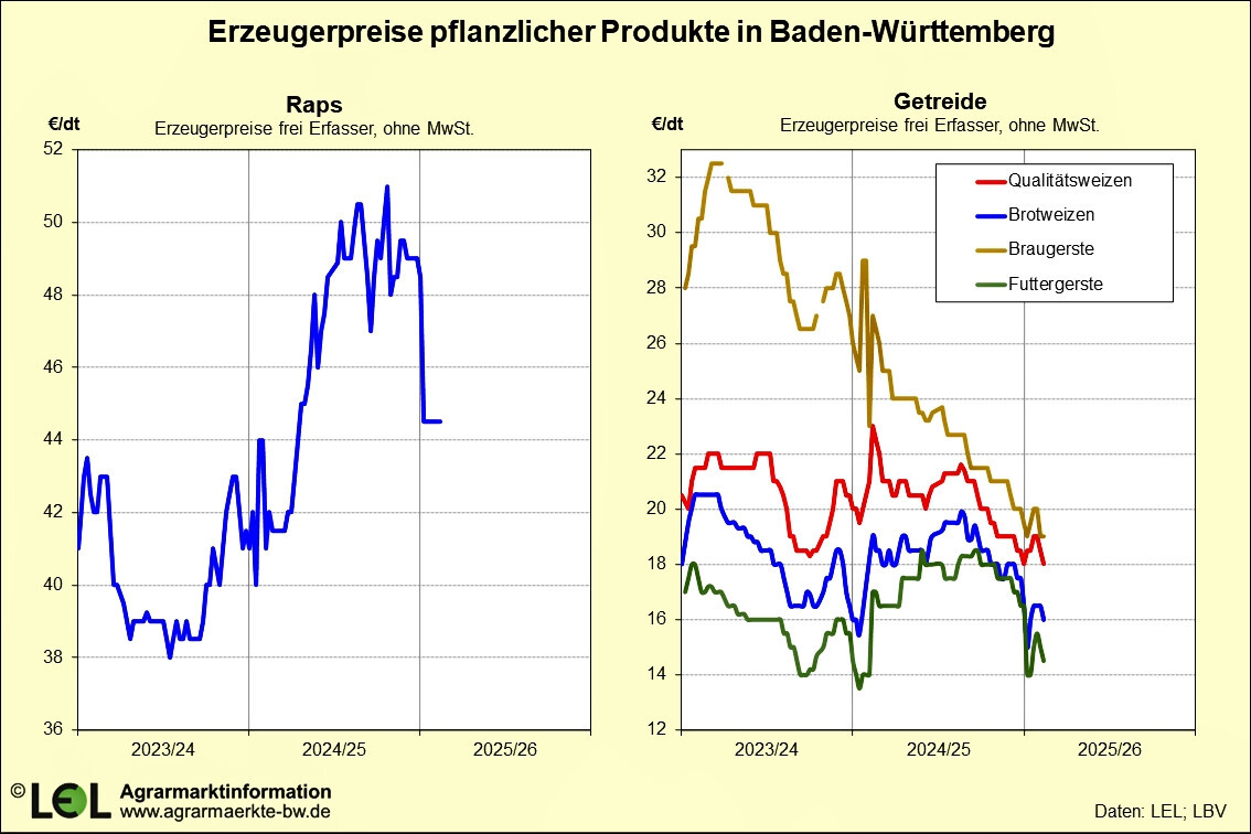 Auch beim Raps zeichnet sich dieses heterogene Bild ab, inwiefern freie Fettsäuren (FFA) nach dem Regen die Qualitäten belastet haben, bleibt abzuwarten. Global ist 2025/26 laut USDA eine vergleichsweise gute Versorgung von Raps zu erwarten, dies gilt auch für die Erträge in Baden-Württemberg. Die Preisentwicklung in den vorangegangenen Wochen ist geprägt von Unsicherheiten wie beispielsweise den Zollankündigungen Chinas auf kanadischen Raps. Preislich wirken sich beim Weizen der starke Euro und die guten Ernten der Welt aus. Auch die derzeit als gut erwartete Maisernte drück zusätzlich auf den Weizenpreis. Bei der Braugerste sind die Auswirkungen des guten Angebots der Ernte 2024 zu spüren. Druschergebnisse von Gerste vor dem Regen waren durchweg positiv in Menge und in der Qualität. Die Auswirkungen der Niederschläge müssen abgewartet werden, sie sind sicherlich jedoch geringer als es beim Weizen der Fall ist.