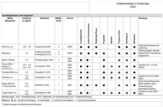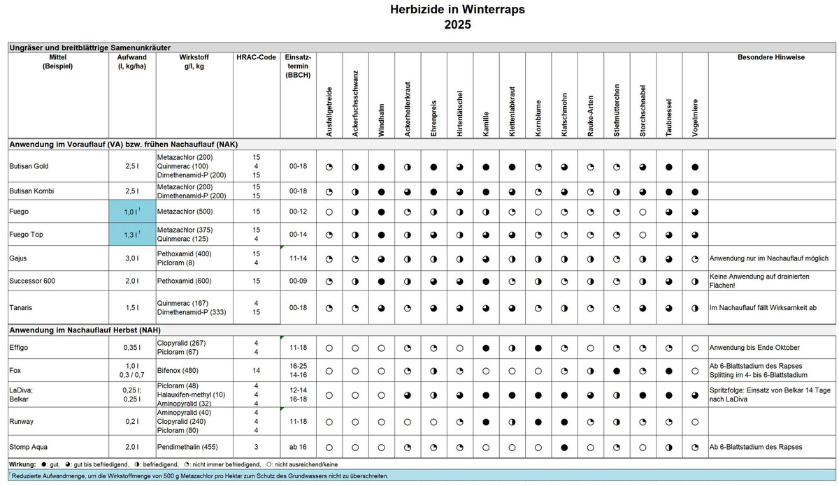 Ein zügiger und gleichmäßiger Feldaufgang ist die Grundlage für eine gute Bestandesetablierung des Rapses und damit einer hohen Konkurrenzkraft gegenüber Unkräutern. Entscheidend dafür sind vor allem die richtige Bodenbearbeitung und ein optimal gewählter Saattermin. Für einen optimalen Auflauf und eine schnelle Jugendentwicklung benötigt der Raps ein feines, gut abgetrocknetes und abgesetztes Saatbett. In kräftigen Beständen beschränkt sich der Herbizidbedarf meist auf schwer kontrollierbare Problemunkräuter wie Klettenlabkraut, Storchschnabel oder Kreuzblütler. Neben der Kontrolle von Unkräutern ist die Bekämpfung von Ungräsern und Ausfallgetreide im Raps im Auge zu behalten. Besonders der Ackerfuchsschwanz breitet sich zunehmend aus.