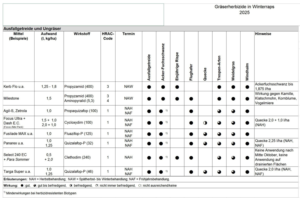 - Propyzamid (HRAC 3): Muss im Spätherbst bis Winter bei kühler und feuchter Witterung appliziert werden. Bodenfeuchte und Niederschlag sind zwingend erforderlich, damit der Wirkstoff in den Boden gelangt.
